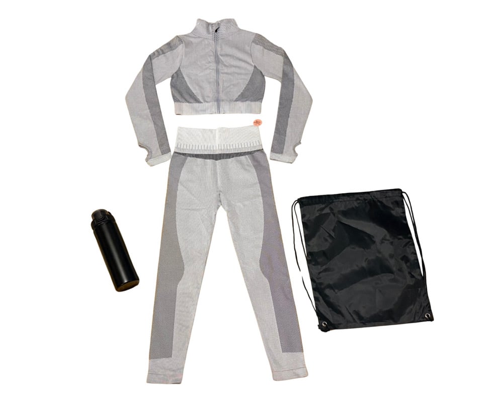 5. Power Performance Trio Box – Black & Silver set + Jacket (3 Count) Complete your look with our Black & Silver 2-piece fitness set and matching jacket.💖 Bonus: Includes a FREE black drawstring bag!