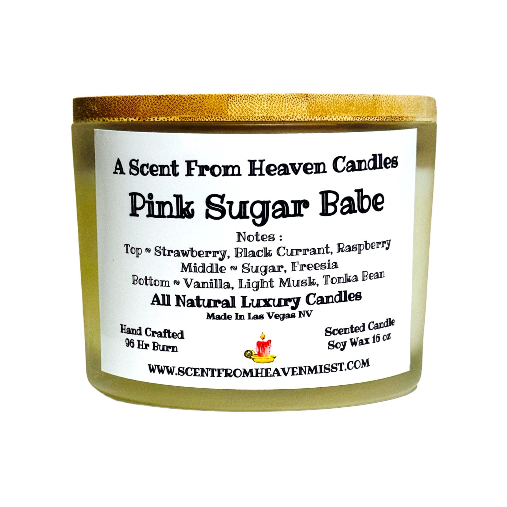 Our Pink Sugar Babe candles is a sweetly sophisticated take on a cotton candy fragrance. This sugary scent is enhanced by fruity notes of strawberry, raspberry, and black currant, while base notes of tonka, vanilla, and a hint of light musk keep this ultra sweet scent grounded. This fragrance is infused with natural essential oils including orange sweet and lemon.